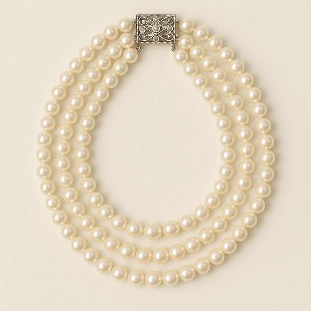 Hand-strung and finished with a vintage-style clasp, the three graduated layers of pearls frame the neckline with effortless sophistication. Whether paired with a simple black dress or a crisp pastel ensemble, this necklace doesn’t just complete an outfit—it makes a statement.